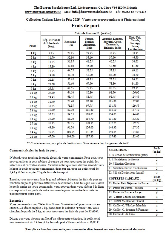 ** Étant donné que notre site Web ne fait pas la distinction entre l’Irlande du Nord et le Royaume-Uni, sélectionnez « Irlande » comme pays de livraison dans le processus de paiement si vous souhaitez qu’une commande soit envoyée à une adresse en Irlande du Nord. Cela vous permettra d’économiser les frais de transport. Ensuite, dans le champ du code postal, saisissez l’Eircode V95 HD70 du Burren Smokehouse. Si nécessaire, saisissez également Lisdoonvarna comme ville. Assurez-vous de saisir les véritables détails de l’adresse de livraison dans les autres lignes d’adresse afin que nous sachions où envoyer la commande. Nous la modifierons ensuite manuellement pour la bonne adresse de livraison dans notre système.