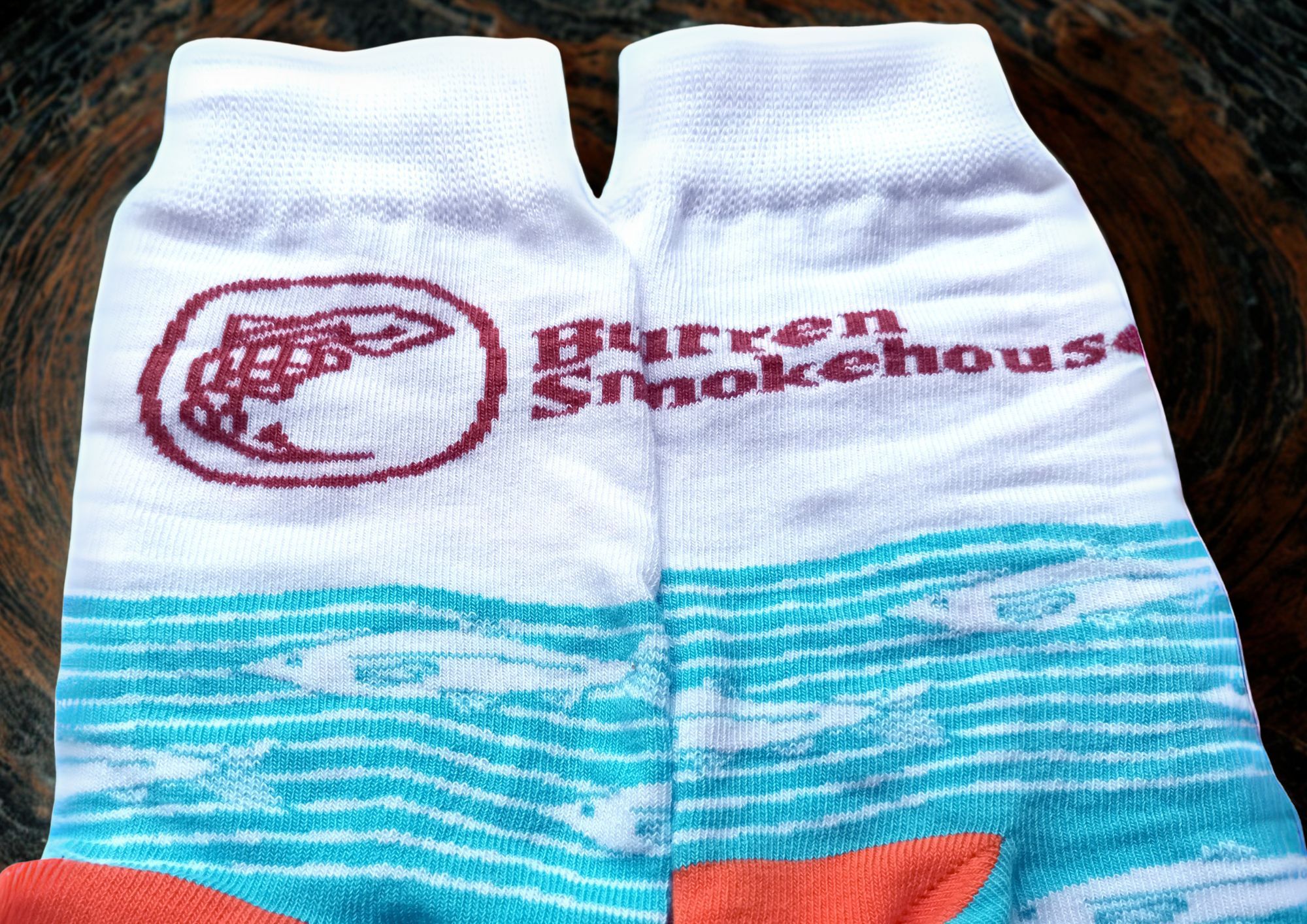 We designed these funny socks for everybody who loves wearing unusual footwear. The underside reads “Salmon for the Sole”.